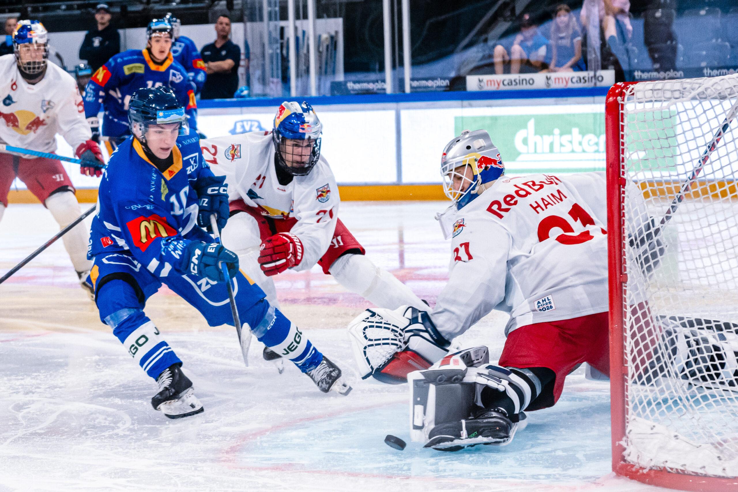 Head coach Reto Suri’s team was already leading 3-0 at halftime. After the visitors from Salzburg (AUT) scored a consolation goal in the 36th minute, Zug increased their lead in the final period with two more goals to make the final score 5-1. The goals for EVZ were scored by Jan Daron (2nd minute, assisted by Flavio Sauser), Loris Wey (PP, 19th minute, assisted by Nando Schriber), Nicolas Kaufmann (25th minute, assists Colind Lindemann, Mischa Geisser), Dario Schilter (49th minute, assists Tom Braschler, Loris Wey) and Loris Wey (PP, 60th minute, assists Colin Lindemann and Robin Antenen).