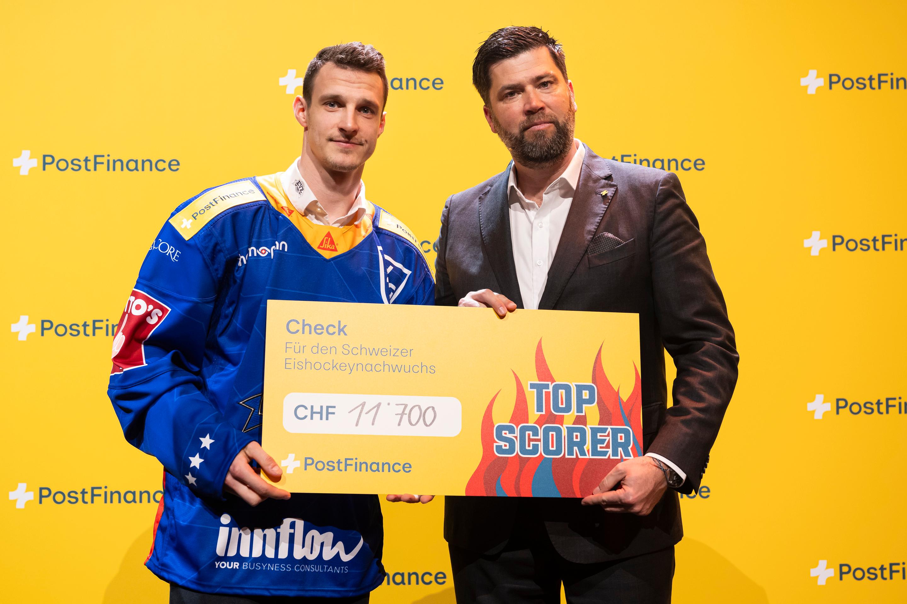 Czech winger Dominik Kubalík scored 39 points (22 goals, 17 assists) in 49 games in his debut season with the EVZ. Kubalík received a cheque worth CHF 11,700 from PostFinance Executive Board member Ron Schneider at the Top Scorer awards ceremony in Bern on Wednesday afternoon.
